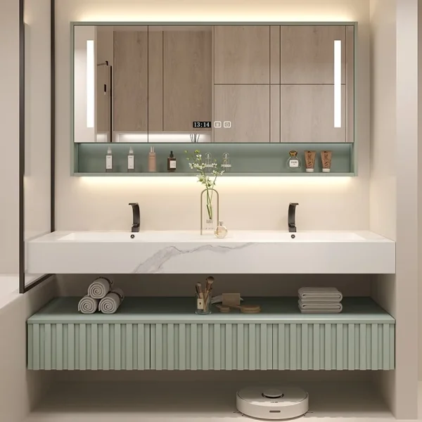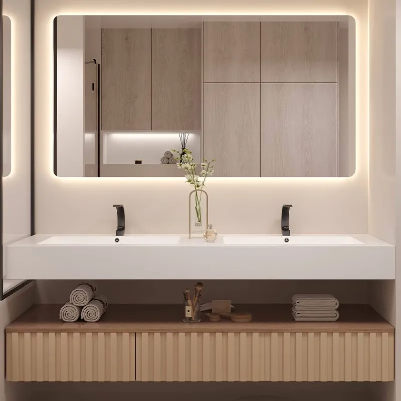 Modern Minimalist Smart Led Mirror Waterproof Plywood Mdf Bathroom Cabinets With Double Ceramic Sink